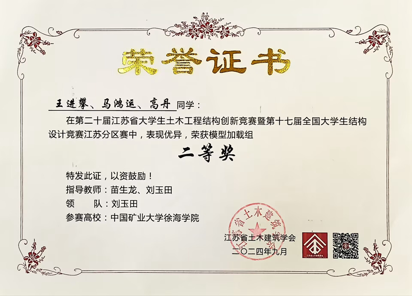 据悉,江苏省土木工程结构创新大赛由中国土木工程学会教育工作委员会江苏分会主办,是一项在全省设置土木工程专业的各高校中开展的、具有导向性、示范性和群众性的大学生课外学术科技创新竞赛活动,每年举办一届,是全省高校土木专业本科生中的品牌赛事,是培养“未来结构大师”的摇篮。一直以来,学院高度重视大学生课外学术科技竞赛活动,注重培养大学生的创新精神和实践能力,着力构建课程建设、学科竞赛相结合的人才培养模式。自2016年首次参加大学生土木工程结构创新分级赛至今,学院共获得国家级二等奖3项、三等奖1项,省级一等奖5项、二等奖8项、三等奖2项、优秀奖1项。