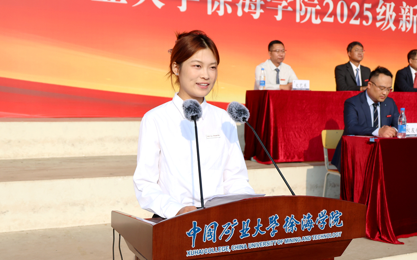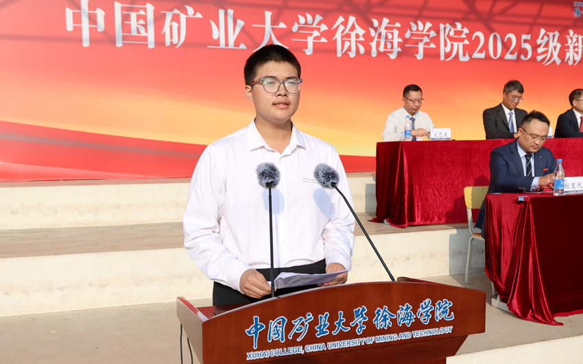 文艺系教师周生虎,2008届毕业生、徐州市贾汪区委组织部副部长张睿,经管系2023级学生张园翊,信电系2025级新生张鸿彬分别作为教师代表、校友代表、在校生代表、新生代表发言。周生虎老师以“爱国、探索、从容、团结、创新、奉献”为关键词,讲述 “历史上的今天”,勉励新生志存高远、好学力行。张睿校友分享了自己的求学历程和基层奋斗体悟,希望同学们勇于探索,练就过硬本领,在实践中收获成长。张园翊同学结合自身成长经历,鼓励学弟学妹们锚定方向、勤奋耕耘,在知行合一中成就更好的自己。张鸿彬同学号召全体新生将梦想化为行动,用脚步丈量未来,以奋斗之笔描绘最绚丽的青春画卷。