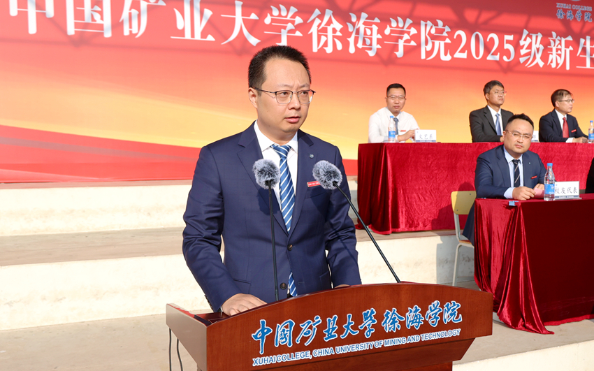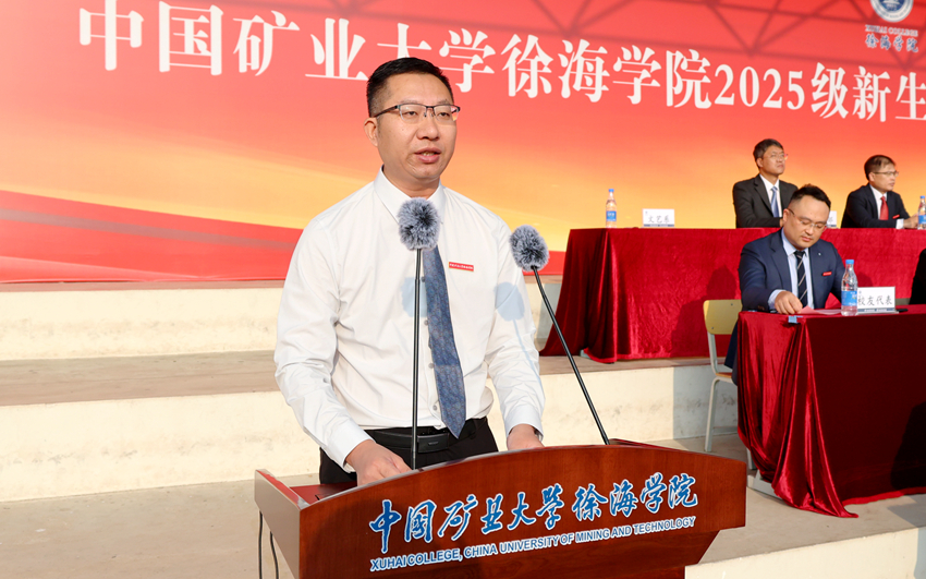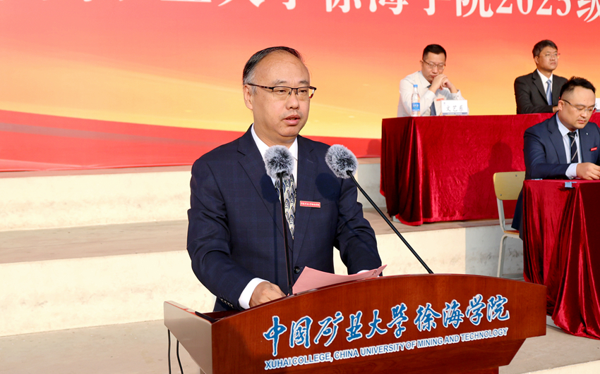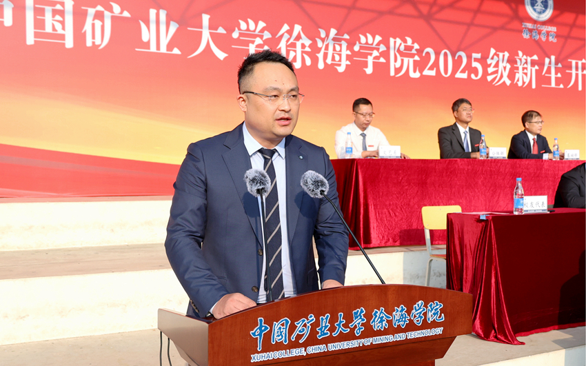 黄军利代表中国矿业大学和徐海学院理事会向2025级新同学表示热烈欢迎和诚挚问候,并介绍了中国矿业大学116年的办学历程、发展成就,以及徐海学院大学路校区建设情况。他表示,中国矿业大学将一如既往地支持徐海学院的建设与发展,为徐海学院提升综合办学实力、优化育人环境、实现高质量发展提供坚强后盾。在“军训”这大学第一课顺利“结课”之际,他向同学们提出四点希望:一是努力学好专业知识,积极利用矿大丰富的学习资源,求真学问、练真本领;二是多读书、读好书,既要精读专业书籍,又要广泛涉猎人文科学、自然科学和社会科学各类知识;三是坚持锻炼,有个好身体,在奔跑、跳跃和汗水中锤炼意志、强健体魄;四是快乐生活,有个好心态,在挫折中播种希望,笑看风雨之后的彩虹。作为与新时代同向同行、同频共振的一代,他期待同学们能把个人奋斗同国家前途命运紧紧联系在一起,跑好历史的接力棒,在推进中国式现代化的宽广舞台上绽放绚丽的青春光彩。