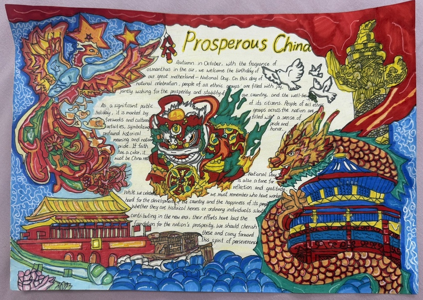 同学们紧扣国庆主题创作,将国家发展成就、中华优秀传统文化与个人成长感悟融入作品。一幅幅手抄报图文并茂,不仅英文书写规范流畅、版面设计新颖别致,更以细腻的绘画笔触传递情感,充分展现出同学们扎实的英语运用能力与丰富的艺术创造力,让爱国情怀在笔尖与画纸上生动流淌。经过评选,最终,电气23-6班李阳斩获一等奖;物联网25-3班濮佳珂、人工智能25-1班张熙晨获二等奖;会计24-6班徐颖琪、会计24-4班阚广瑞、会计24-6班王秋童获三等奖。