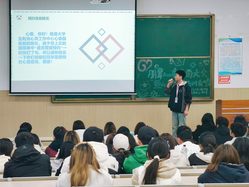为进一步夯实学校心理委员队伍素质基础,加强学生自我心理调节与同伴帮扶能力,院心理中心于10月24日在一南101教室组织开展朋辈辅导员与第25届心理委员见面会暨心委专题培训会。