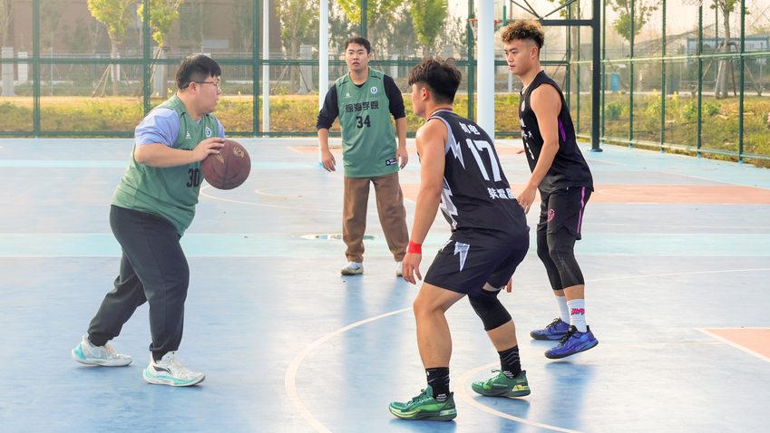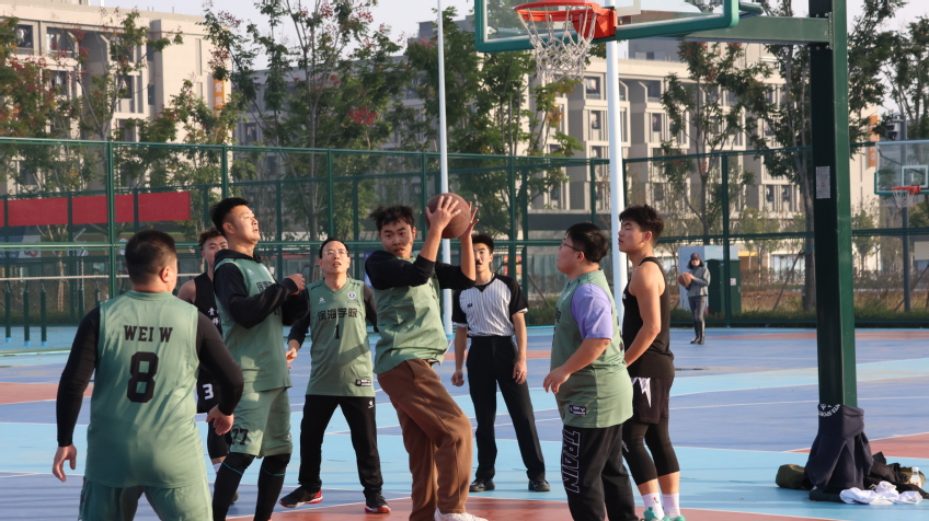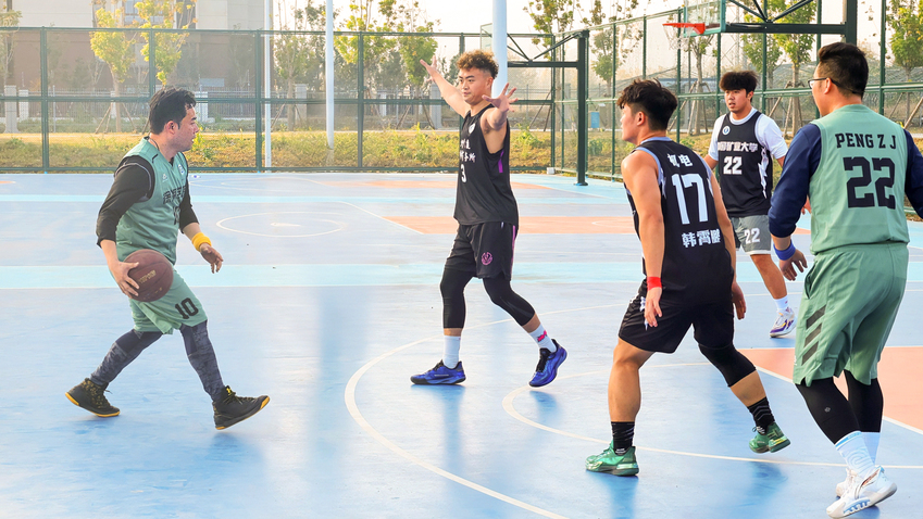 学院党委副书记、纪委书记邢雅伟为比赛开球。首节开始,学生队迅速进入状态,凭借充沛体能和灵活跑动频频发起进攻;教师队则沉着应对,依靠稳定的节奏控制和精准传球稳住阵脚。双方你来我往,比分交替上升,场面一度胶着。场边观众热情高涨,加油声此起彼伏。