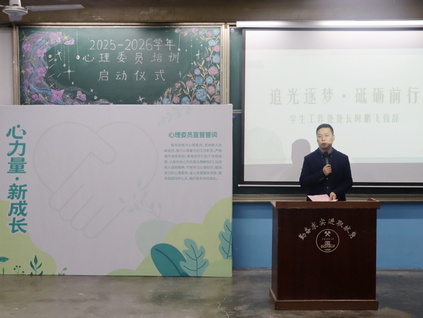 11月13日晚,院心理中心于主西一教室举办“心力量·新成长”2025-2026学年心理委员专题培训班启动仪式。学生工作处处长时鹏飞、院心理中心负责老师方菲,周雨曦、徐州市东方人民医院心理专家刘媛医生出席活动,2025级心理委员、2024级优秀心理委员代表、各系心理健康部成员及大学生阳光心灵工作中心成员参加了此次活动。
