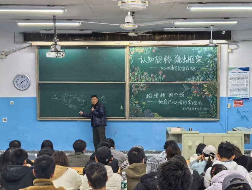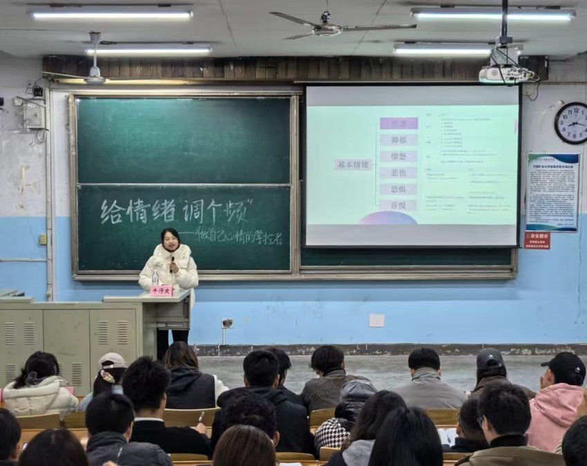在“认知旋转、跳出框架”主题分享中,周雨曦老师结合大学生常见的认知与体感问题,通过“改变思维定势”“反向思考练习”等互动形式,深入浅出地解析了认知固化的形成原因与危害。 他提出“感理双重才构成理体”、“认知可旋转”等见解,通过真实案例拆解引导同学从“非黑即白”的认知模式中走出,以多元视角看待问题。改变固化思维,深入理性思考。而在给情绪“调个频”主题环节,牛得爽老师从基本情绪入手,系统讲解了情绪识别、情绪接纳与情绪调节的实用技巧。牛老师巧妙化用突发小插曲,通过实景拆分,让心理委员们直观掌握如何帮助自身及同学缓解焦虑、抑郁等负面情绪,实现情绪的正向调节。此外,牛老师提出多种适用方法用以快速稳定情绪。两位老师的讲解理论与实践结合,既有专业深度又具可操作性,帮助心理委员们清晰认识到认知引导与情绪调节在心理工作中的关键作用,为后续开展班级心理帮扶提供了具体方法支撑。