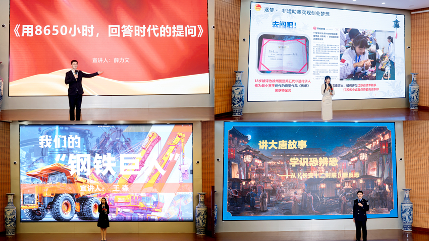四位优秀青年讲师王森、李子艺、薛力文、曹海森依次登台进行示范宣讲。他们结合自身奋斗实践,分别讲述了徐工集团的创新攀登、非遗面塑的守正创新、志愿服务的温暖坚守以及全民反恐的知识普及,充分展现了徐州青年在各条战线上锐意进取、奋勇争先的青春风采。