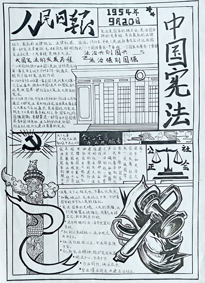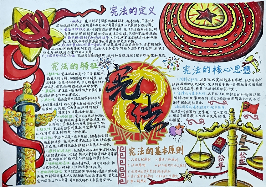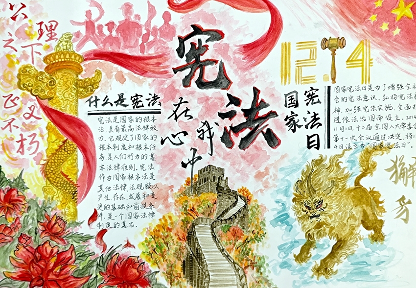各系共推荐44份作品参与评选。活动期间,同学们利用课余时间认真研读宪法条文,精心构思版面设计,以画笔和色彩将对宪法的理解与敬意凝聚在手抄报中。评选现场,评委们依据作品的内容准确性、主题契合度、版面设计及艺术表现等方面进行综合评审。最终,外语系卢可欣等6名同学获一等奖,文艺系徐可等8名同学获二等奖,计算机系宋博文等12名同学获三等奖。12月4日,获奖作品在主楼一楼大厅集中展出,供师生观摩交流,在欣赏与互动中进一步理解宪法内涵、感受法治文化。