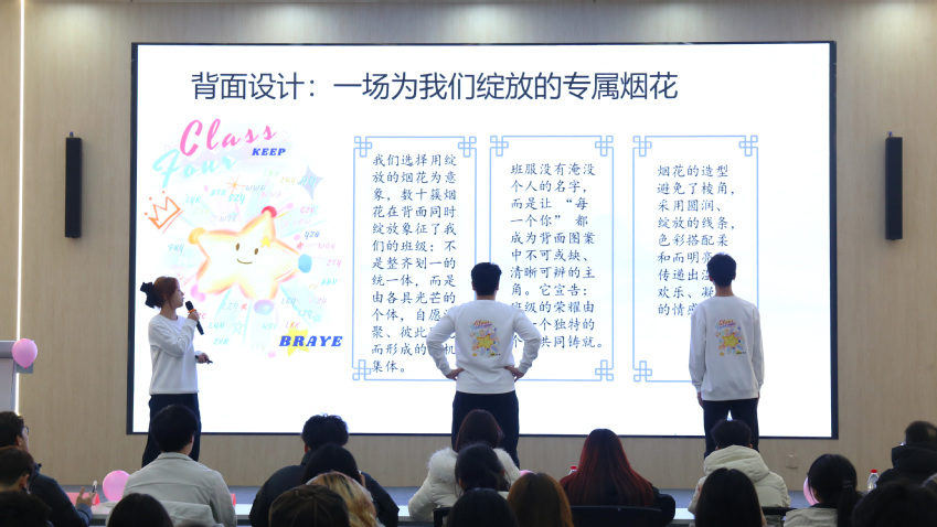 比赛中,各班级依次上台展示,通过PPT讲解、实物呈现、才艺表演等多种形式,系统阐述班徽、班服、班旗的设计理念与象征意义。同学们充分发挥专业特色,将学科元素与班级精神相融合:或以代码、齿轮体现工科务实;或以笔墨、典籍传递人文底蕴,或以鲲鹏、锦鲤寓意奋发向上,不仅美观新颖,更凝聚了集体智慧,展现出丰富的创意与鲜明的班级个性。比赛过程中还穿插了才艺表演环节,校园十佳歌手献唱歌曲,个人独奏、诗朗诵等节目依次登场,生动展现出徐海学子多才多艺、全面发展的青春风貌,现场气氛活跃,讲解生动,展示精彩,不时响起热烈掌声。