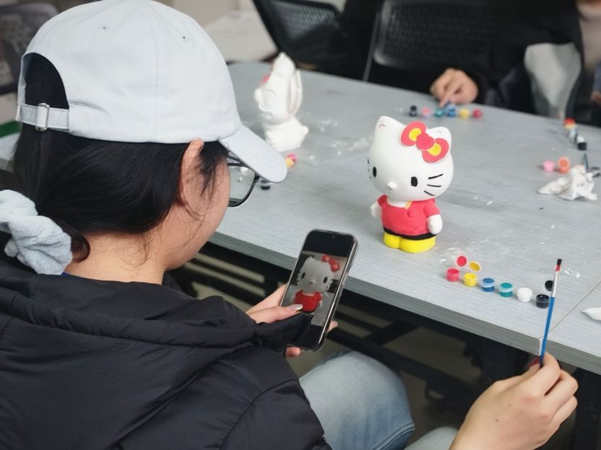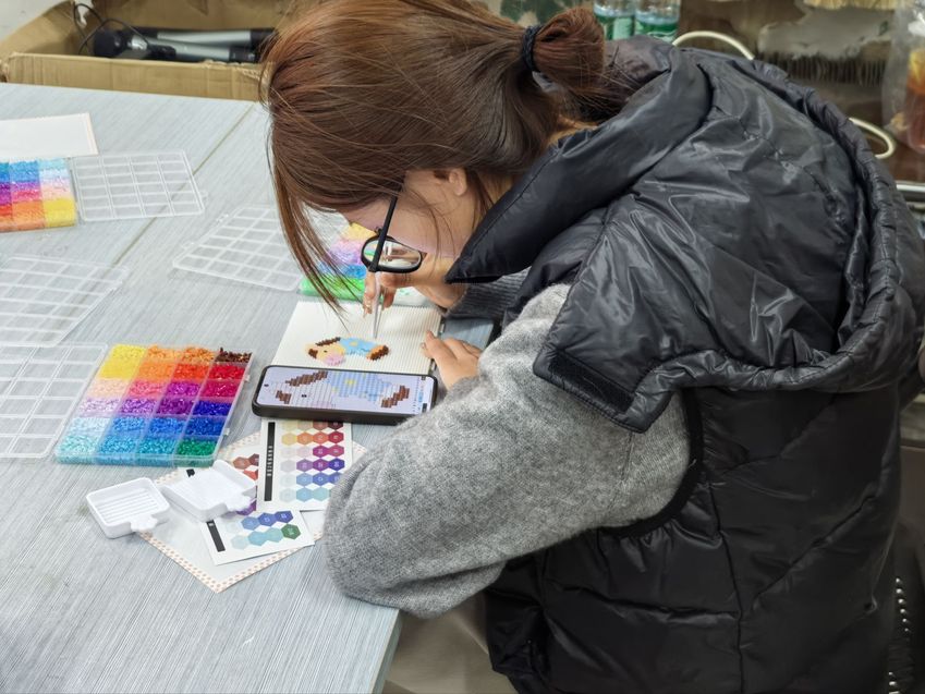 本次活动以趣味手工创作为核心,设置《幸福拼豆》《风鸢绘幸福》《石膏涂满乐》三大特色环节,各环节均配备齐全,专业工作人员全程指引。在幸福拼豆环节,同学们搭配色彩、拼贴图案,将美好期许凝于方寸拼豆,制作成专属挂饰;风鸢绘幸福环节里,大家以笔为媒、以色为语,在空白风筝上勾勒心中幸福图景,寓意放飞烦恼;石膏涂满乐环节中,同学们为纯白石膏娃娃上色,在细腻的创作过程中舒缓身心、释放情绪。活动现场秩序井然,工作人员各司其职,从物资保障、现场引导到创作协助全程贴心服务,同学们在动手创作中专注当下,在互动交流中感受温暖,沉浸式体验手工创作的乐趣与幸福感。