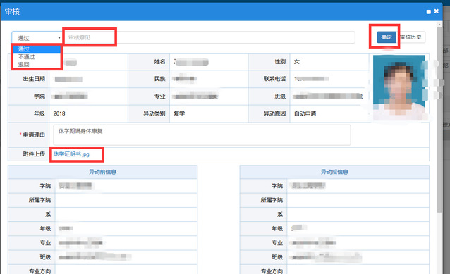 2、审核结论有三种可选:选择“通过”即可填写审核意见转入下一环节,若选择“退回”可以填写修改意见退回到申请人,供申请人修改信息;选择“不通过”则学生无法再次申请。
