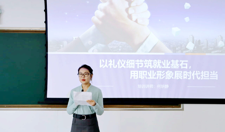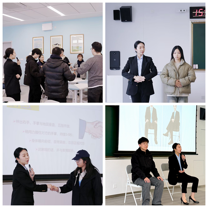 讲座现场,何妍静结合职场真实场景,围绕面试形象管理、沟通礼仪、商务社交礼节、接待拜访礼仪等方面展开讲解。通过现场示范、误区拆解等方式,指出礼仪认知与实践中的常见误区,帮助大家快速掌握实用技巧。互动环节,何老师针对同学们在求职礼仪方面的困惑逐一解答,给予专业建议与指导。