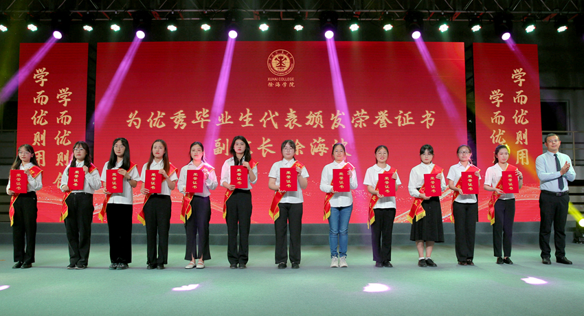 校党委常委、校长助理、徐海学院院长张万红致辞,向学有所成、顺利毕业的同学们致以衷心祝贺,向默默耕耘、匠心育人的老师们,向辛勤付出、无私奉献的家长们,向一直关心和支持母校发展的校友们,表示诚挚感谢。他对2022届毕业生提出了殷切希望:一要坚定理想信念,立定鸿鹄之志。希望同学们把自己的成长成才,融入到国家的发展、社会的进步和民族的振兴之中,不负历史使命,勇担时代重托,在不懈奋斗中实现青春价值、书写人生华章;二要练就过硬本领,勇于创新创造。希望同学们以初生牛犊不怕虎的劲头和逢山开路、遇河架桥的意志,攻坚克难、锐意进取,牢牢把握住成就人才的难得机遇,在创新、创业、创造上取得突出成绩;三要坚持脚踏实地,做到知行合一。希望同学们尊重科学、求真务实、严谨治学、诚信为人,把理想信念和创新精神融入到实际工作中,使自己的思维视野、认知水平、能力素质紧跟时代发展步伐。他激励毕业生们在新征程中踔厉奋发、勇毅前行,在时代浪潮中澎湃青春力量,在实现中国梦的伟大实践中展现新气象、创造新奇迹、谱写新篇章。典礼期间,他为毕业生代表颁发了毕业证书。