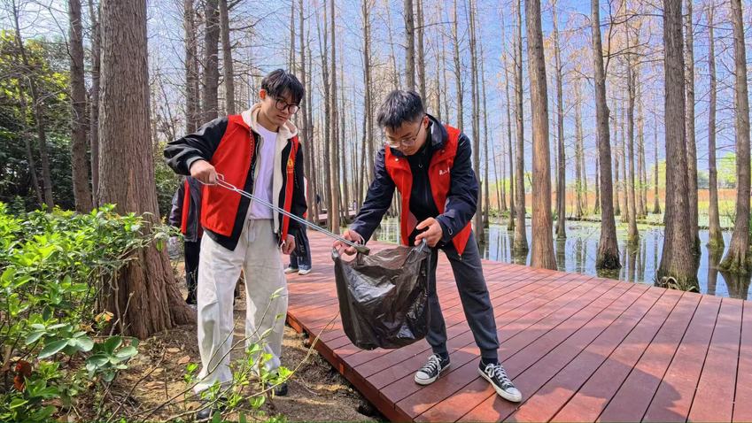 活动开始,志愿者们准时在金山公园池杉步道入口集合,在负责人的统筹安排下,迅速分组开展清理与宣传工作。大家手持垃圾袋、垃圾夹等工具,沿着水杉步道及河道周边细致巡查,弯腰捡拾水面漂浮物,耐心清理沿岸塑料袋、纸屑、烟头等各类垃圾,将捡拾的废弃物分类收纳后统一运送至指定投放点,全力清理卫生死角。春日的云龙湖畔,草木葱茏,志愿者们忙碌的身影穿梭在步道与河道之间,一边细致清理各类卫生死角,一边主动向过往市民普及护河知识、倡导文明出游理念。现场氛围热烈而有序,志愿者们互帮互助、干劲十足,用汗水换来了步道与河道周边环境的洁净清爽,也用真诚的言行传递着生态保护的理念。活动临近尾声,全体志愿者整理好工具,整齐集合,共同拍摄合影,定格了此次志愿服务的美好瞬间。